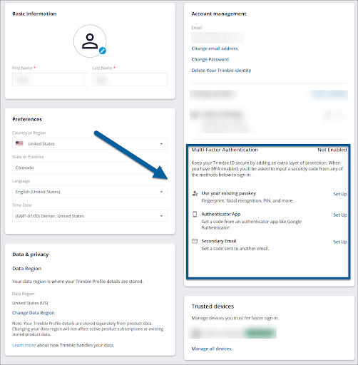 Pokud potřebujete z jakéhokoliv důvodu změnit vícefaktorové ověřování (MFA), můžete tak učinit na myprofile.trimble.com.
