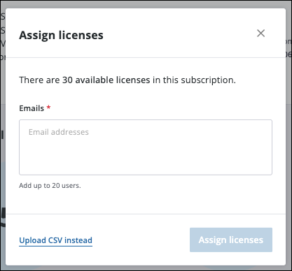 - Select Manage Subscriptions. A page opens listing your subscription details, including total licenses, assigned licenses, and available licenses.
