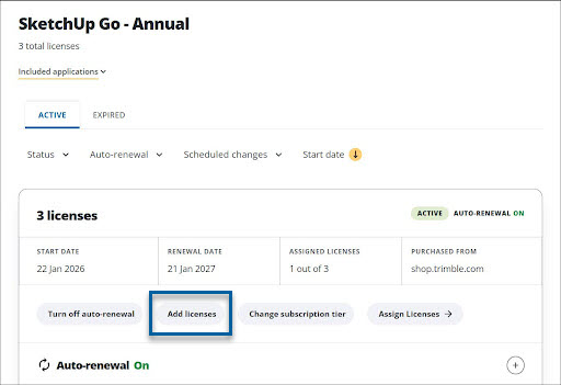 The Trimble Admin Console can help you add licenses to your account’s SketchUp subscriptions. Each license provides access to the products in that subscription to a user. Only an Account Owner or Secondary Account Owner can add licenses.